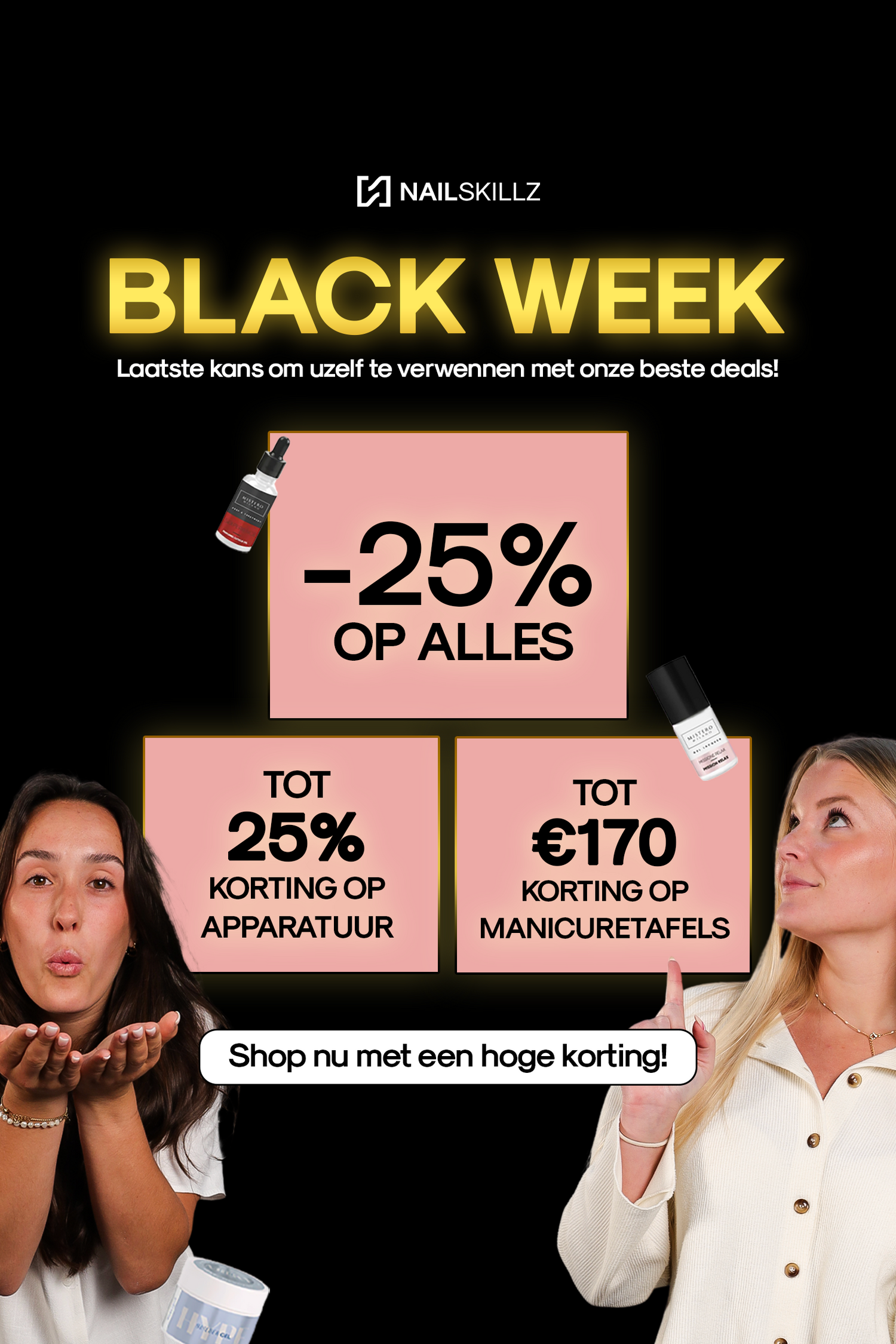 Gedurende de hele week profiteer je van de hoogste kortingen: 25% korting op alles, tot 30% korting op apparatuur en zelfs tot €170 korting op manicuretafels. Maar wees er snel bij, want op = op! Grijp deze unieke kans om je salon te upgraden en te besparen.