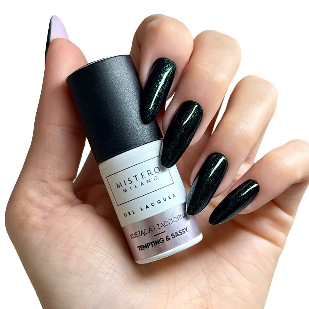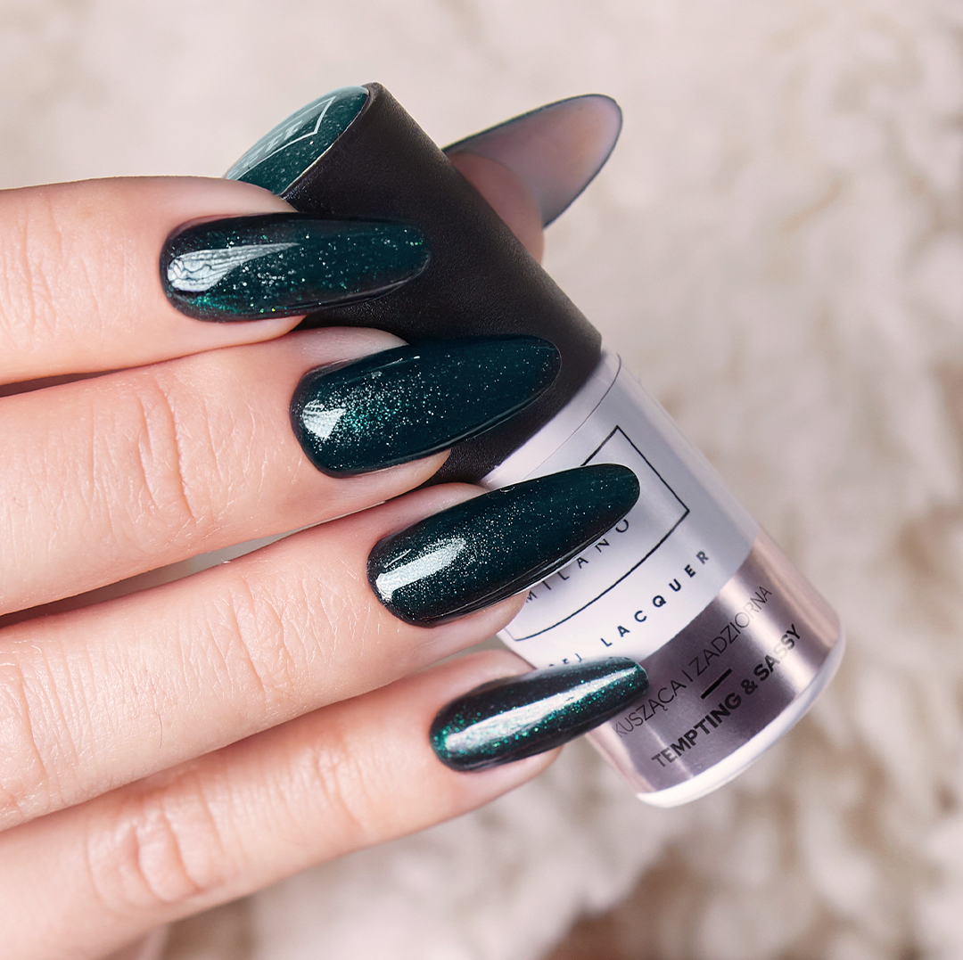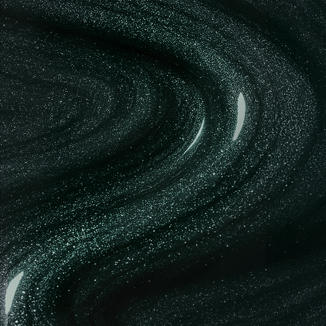 A deep, dark green with shimmering particles that enliven the color, adding dynamism and a unique sheen. It evokes the elegance of festive decorations and the reflections of lights dancing among the branches of a Christmas tree. This is a shade that combines classic with a touch of mischief—refined, magnetic, and unique, designed to command attention.